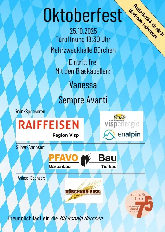 Zusammen mit der Blaskapelle Vanessa organisieren wir am 25. Oktober 2025 ein Oktoberfest in der MZH in Bürchen. Die MG Ronalp, die Vanessa und die Blaskapelle Sempre Avanti werden für Oktoberfest Stimmung sorgen. Zudem gibt es Unterhaltungsspiele wie Bierkrug-Stemmen, Bierkrug-Schieben oder Büchsen-Werfen. Holt eure Dirndl oder Lederhosen aus dem Schrank und kommt vorbei. Jede Person im Oktoberfest-Outfit erhält ein Gratisgetränk!