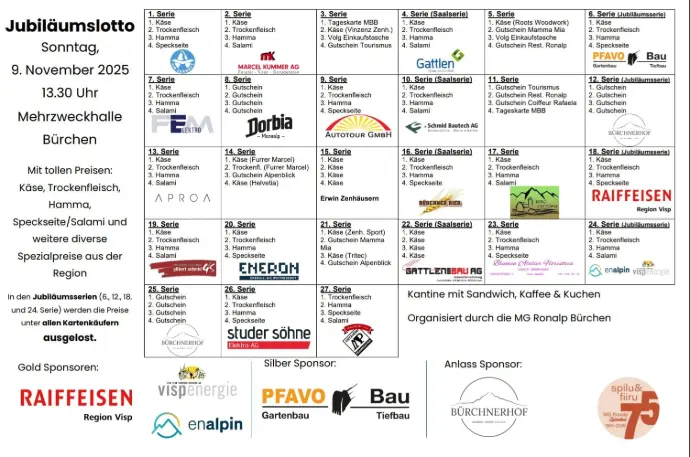 Am 09. November 2025 findet das Spiislotto der MG Ronalp statt. Versucht euer Glück und gewinnt attraktive Preise wie Käse, Trockenfleisch, Hamma, Salami oder Gutscheine.